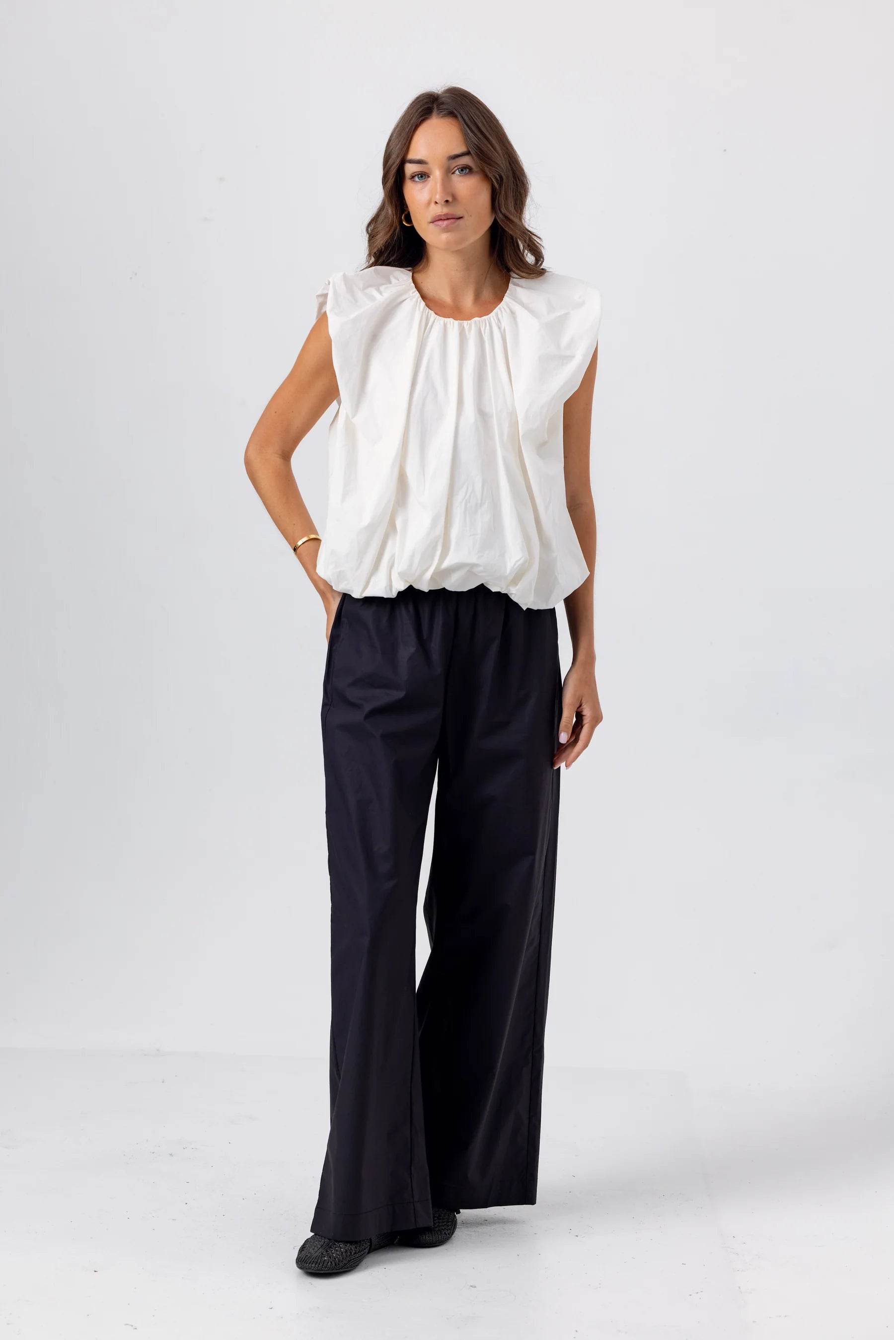 Features a bubble hem and bubble sleeves for a fun, airy feminine shape